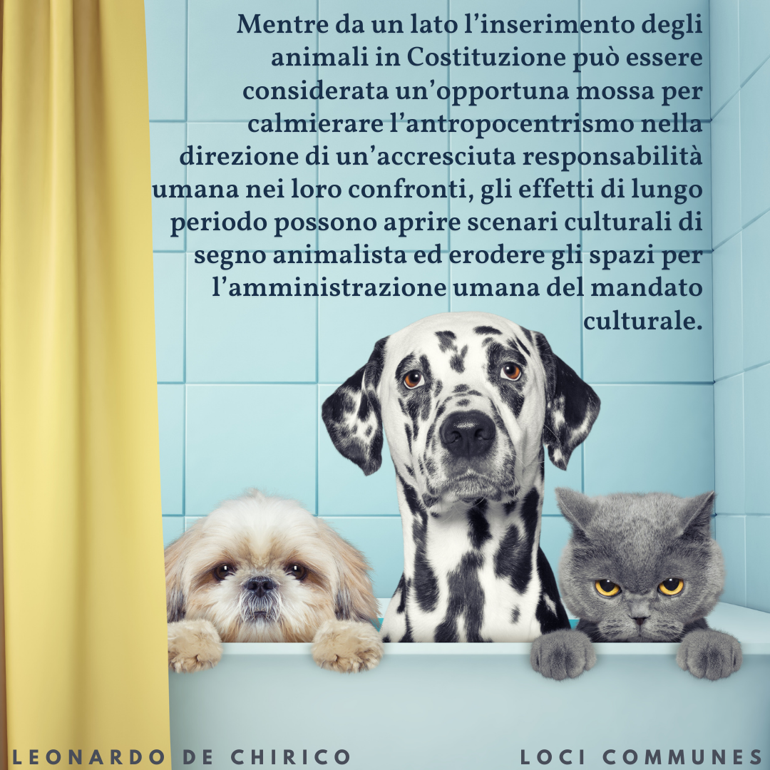 Così, mentre da un lato l’inserimento degli animali in Costituzione può essere considerata un’opportuna mossa per calmierare l’antropocentrismo nella direzione di un’accresciuta responsabilità umana nei loro confronti, gli effetti di lungo periodo possono aprire scenari culturali di segno animalista ed erodere gli spazi per l’amministrazione umana del mandato culturale.