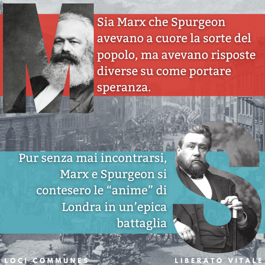 Sia Marx che Spurgeon avevano a cuore la sorte del popolo, ma avevano risposte diverse su come portare speranza. Pur senza mai incontrarsi, Marx e Spurgeon si contesero le “anime” di Londra in un’epica battaglia. Nessuno dei due la vinse, perché quella battaglia è ancora in corso. Al di là del marxismo, la fede cristiana combatte con le armi spirituali della preghiera, dell’evangelizzazione, della catechesi, della formazione, del discepolato contro “tutto ciò che si eleva contro la conoscenza di Dio” (2 Corinzi 10,5).