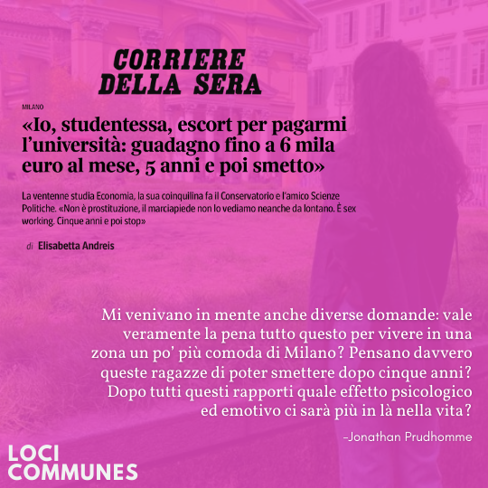 Però mentre leggevo, forse la cosa che mi colpiva di più era l’atteggiamento “sicuro” che queste ragazze avevano riguardo a questa attività. Sembrava quasi di esserci un’aria di onore o anche orgoglio che si percepiva nelle loro risposte. Per esempio dicevano, “Il marciapiede non lo vediamo neanche da lontano, ci mancherebbe. In strada ci sono le vittime della tratta, noi facciamo tutta un’altra cosa … Vendiamo esperienze e non c’è disparità di potere perché noi abbiamo la giovinezza, loro il denaro”. Però più parlavano, più si smascherava la realtà di questo tipo di rapporto. Questo si vede chiaramente nelle parole seguenti: “La prestazione sessuale è il cuore di un accordo che però non si esaurisce lì, comprende anche altro … una sorta di relazione, ma finta, perché dell'altro in realtà non me ne importa niente … C’è tantissima domanda, anche adesso in tempo di Covid. Quindi possiamo permetterci di selezionare solo chi ci interessa, dire se a quelle condizioni ci va bene oppure no. Accompagnarli è una nostra scelta”.